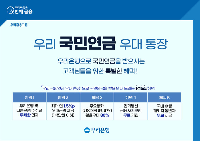 우리 국민연금 우대통장은 해당 통장으로 국민연금을 수령할 경우 금액에 상관없이 금리우대·수수료 면제·환율 우대·전기통신 금융사기 보험·국내 여행 패키지 서비스 등 총 5가지 혜택을 제공한다.