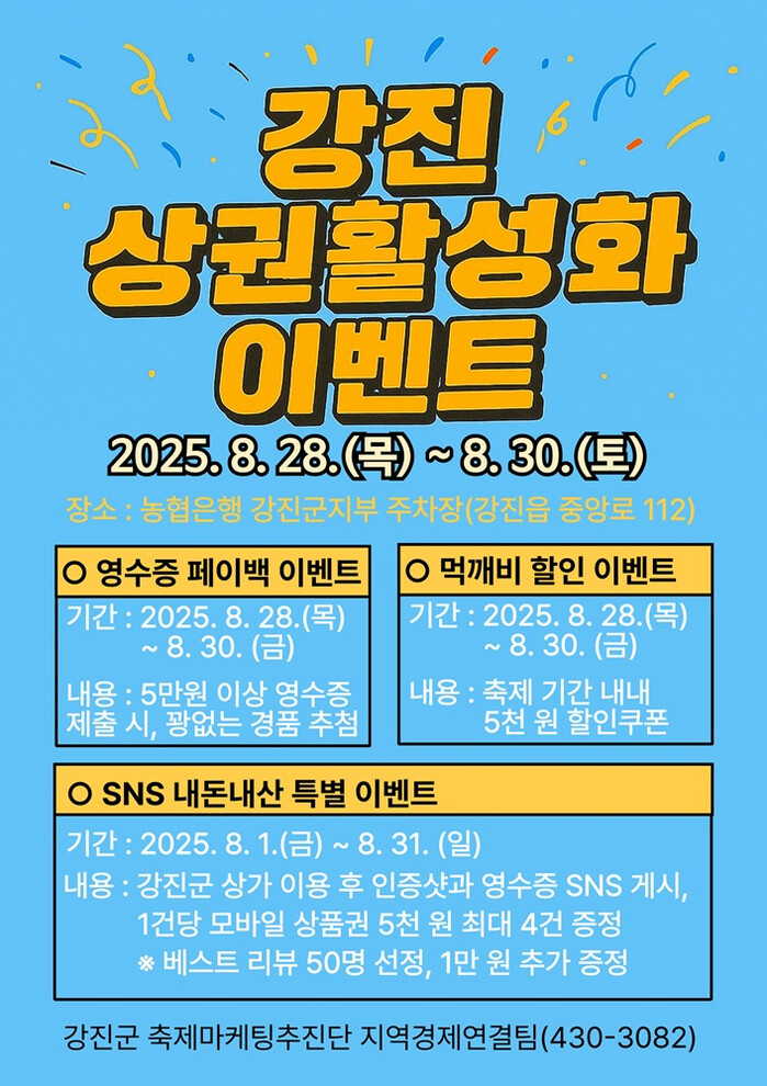 이번 이벤트는 상가 방문객 및 소비 촉진을 유도해 강진읍 골목상권의 활력을 불어넣기 위해 진행되며, 주요 이벤트로는 강진사랑상품권 영수증 페이백 이벤트, 무료 체험 프로그램, 꽝 없는 돌림판 이벤트, ‘강진맛깨비’ 먹깨비 할인 이벤트, SNS 내돈내산 특별 이벤트 등이 있다.