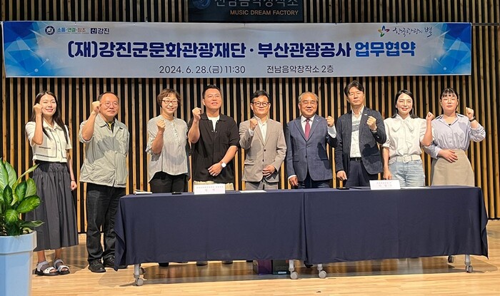 | ▲ 임 석 (재)강진군문화관광재단 대표이사가 이정실 부산관광공사 사장과 지난 6월 28일 강진군 소재 전남음악창작소에서 문화관광 활성화를 위한 업무 협약을 체결하고 관계자 등과 기념촬영을 하고 있다./ 강진군 제공 |