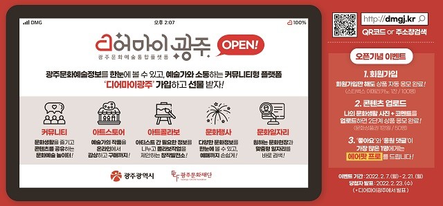 오픈 기념으로 진행되는 이벤트도 풍성하다. 이벤트 기간 ‘디어 마이 광주’에 회원가입만 해도 추첨을 통해 100명에게 아메리카노 1잔 교환권을 증정한다. 가입 후 문화생활 사진과 코멘트를 업로드 하면 50명을 추첨해 문화상품권 1만원 권을 증정한다. 이중 가장 많은 ‘좋아요’와 ‘응원댓글’을 받은 1명에게는 에어팟프로를 증정한다.