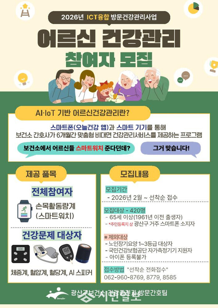 광산구 관계자는 “스마트 기술을 활용해 어르신이 건강한 생활 습관을 형성하고 만성질환을 관리할 수 있도록 돕겠다”며 “어르신들이 자가건강관리 역량을 강화해 건강한 노후를 보낼 수 있도록 최선을 다하겠다”고 전했다.