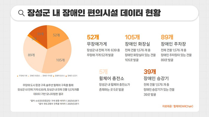 윌체어는 장성군 지역 내 600여 개의 음식점 및 카페를 대상으로 휠체어 접근 가능 여부를 조사했으며, 빅데이터 기반 무장애 도시 환경 구축 솔루션을 통해 무장애가게 52개소, 장애인 화장실 105개소, 장애인 주차장 89개소, 휠체어 충전기 5개소, 장애인 승강기 39개소 등 총 290개의 교통약자 편의시설 정보를 발굴·데이터화했다. 특히 장애인 화장실과 주차장은 공공과 민간시설을 모두 아우르는 전수조사를 통해 구축됐다. 또한, 윌체어는 무장애가게와 교통약자 편의시설별 우선 개선 지점도 데이터 분석을 통해 도출해 제공하고 있다.