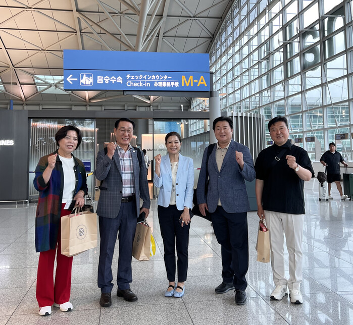 | ▲ 유니세프 그린스쿨 현장 방문단이 6월 30일 인천공항에서 몽골로 출발 전 파이팅을 외치고 있다.(사진 왼쪽부터 신계용 과천시장, 이용록 홍성군수, 조미진 유니세프한국위원회 사무총장, 임병택 시흥시장, 최재구 예산군수) /사진제공=시흥시 |