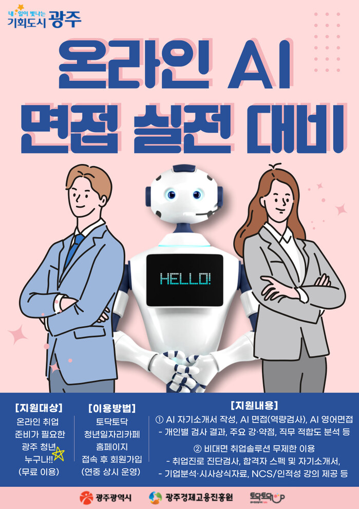 현장에서 직접 체험하는 오프라인 인공지능(AI) 면접 서비스는 토닥토닥 청년일자리카페(광주시), 대학일자리플러스센터(전남대·조선대·호남대), 청춘발산공작소(서구), 청춘이랑(북구), 청청플랫폼(광산구) 등에 예약 후 방문하면 된다.
