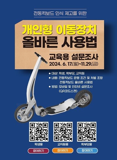 또한, 충북교육청은 학생 눈높이에 맞는 안전의식 제고를 위하여, 오는 11월까지 학생.학부모.교직원을 대상으로 <개인형이동장치 올바른 사용법>을 주제로 온라인 교육을 진행하고 있다.