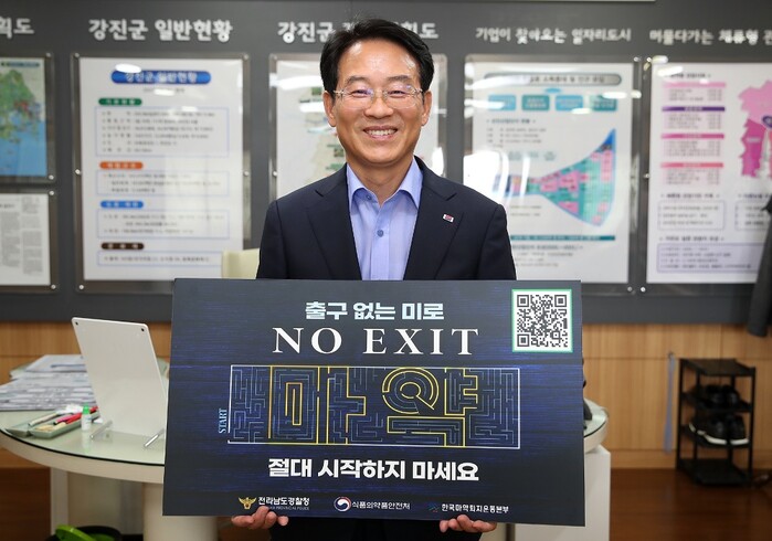 강진원 군수는 지난 7일, ‘출구 없는 미로 마약 절대 시작하지 마세요’라고 쓰여진 팻말을 들고 경찰청과 식품의약품안전처, 한국마약퇴치운동본부가 진행하는 마약범죄 근절을 위한 릴레이 캠페인에 참여했다.