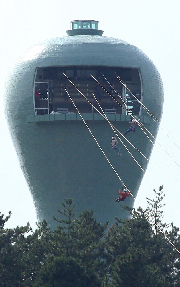 | ▲ 강진군을 방문한 관광객들이 가우도 청자타워에서 짚트랙 체험을 하고 있다. / 강진군 제공 |