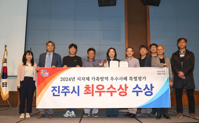 이번 수상은 지난 8월 경상남도에서 진행한 ‘2024년 지자체 가축방역 우수사례 특별평가’결과 발표에 따른 것으로, 진주시는 2023년 고병원성 조류인플루엔자 차단을 위한 선제적 방역조치, 럼피스킨 예방백신 신속 접종, 가축 무료 순회진료 추진 등 차별적이고 효율적인 방역시책을 추진해 도내 1위 평가를 받았다.