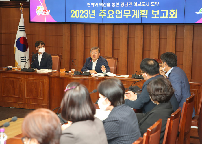 [밀양=최성일 기자] 밀양시(시장 박일호)는 지난 17일부터 26일까지 ‘영남권 허브도시 밀양으로 도약하다’라는 기치 아래 변화와 혁신을 통한 역점사업의 추진과 성과의 연계·확대에 주력해 나가기 위한 2023년 주요업무계획 보고회를 개최했다.