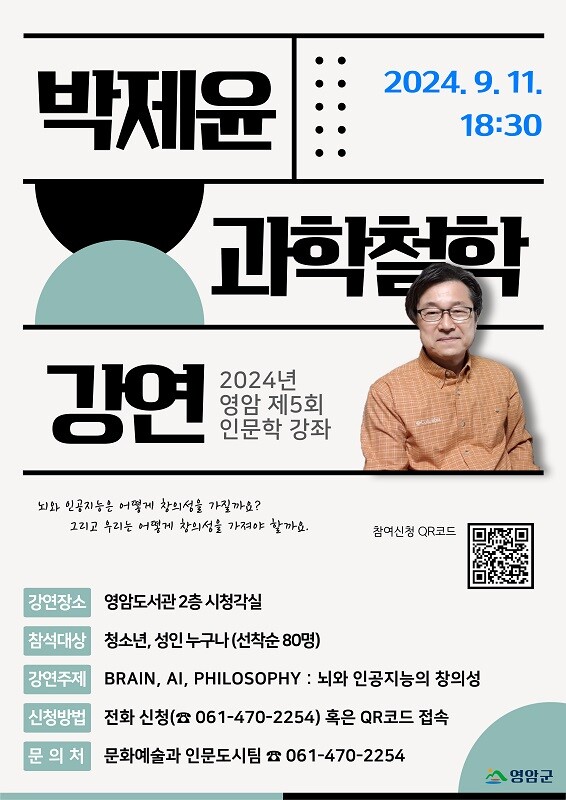박혜영 영암군 문화예술과장은 “최근 주목을 받고 있는 뇌와 인공지능을 주제로 창의성과 윤리에 대해 생각해 보는 시간에 영암군민의 많은 관심과 참열 바란다”고 말했다.