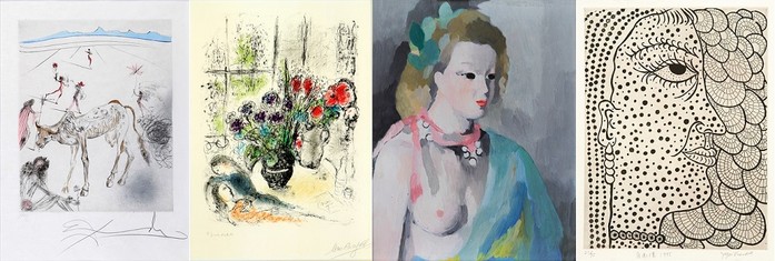 | ▲ 왼 쪽부터 살바도르 달리_히피시리즈 놀란 소_1969-70_54x38cm_종이에 에칭(드라이 포인트), 마르크 샤갈, 연인들의 꽃다발-1976_64x48cm 판화지에 석판, 마리 로랑생_여인_1940년대 34x26cm 캔버스에 유채, 쿠사마 야요이_자화상_1995_32x24cm_종이에 에칭(판화) |