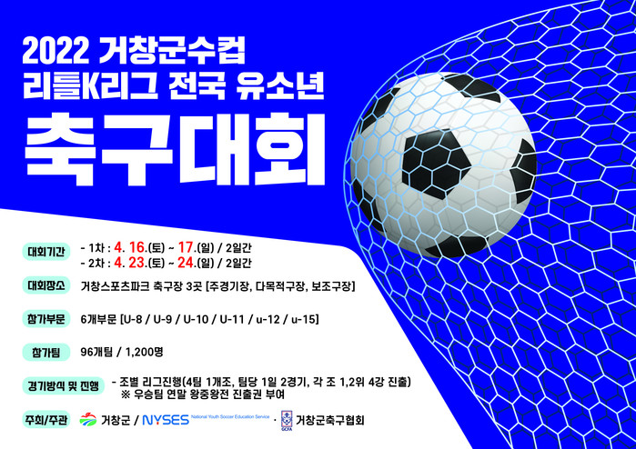 거창군은 오는 4월 16일부터 17일까지와 4월 23일부터 24일까지 2차에 걸쳐 스포츠파크 축구장에서 2022 거창군수컵 리틀K리그 전국 유소년축구대회를 개최한다.