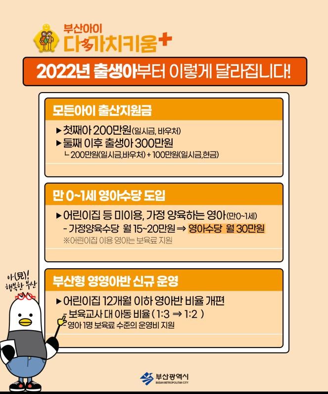 부산시(시장 박형준)는 아이와 부모에게 힘이 되는 행복도시 조성을 위해 내년부터 ‘영아기 집중투자’ 사업을 중점적으로 추진한다고 밝혔다.