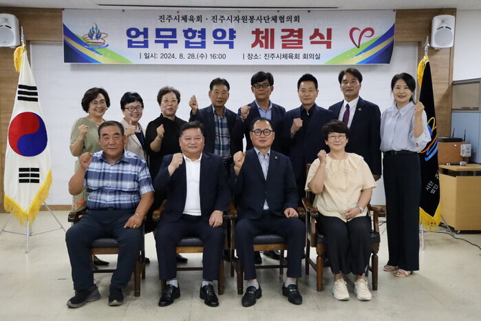 진주시자원봉사단체협의회와 진주시체육회는 28일 진주시체육회 회의실에서 심명환 진주시자원봉사단체협의회장과 김택세 진주시체육회장 등 양 기관 관계자가 참석한 가운데 진주시 체육발전과 자원봉사 활성화를 위한 업무협약을 체결했다.