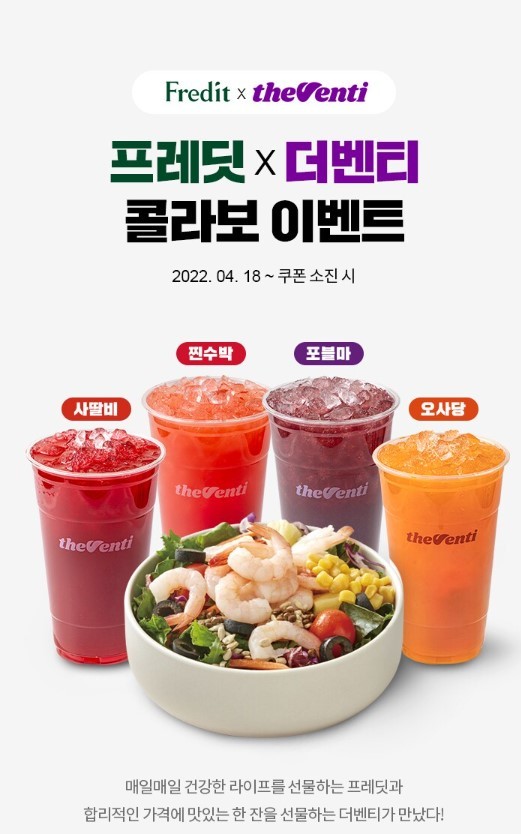 hy는 더벤티의 신메뉴 오늘의 과채루틴 4종 구입고객에게 ‘잇츠온 샐러드 할인 쿠폰’을 지급한다. 이벤트 참여 방법은 더벤티 매장에서 신제품 구입과 함께 쿠폰을 수령하고, hy 온라인몰 프레딧에서 쿠폰코드 등록 후 원하는 샐러드를 결제하면 할인이 적용된다.