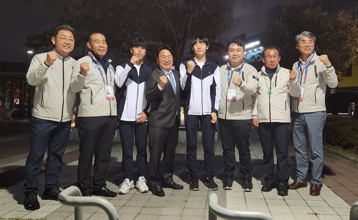 [광주=정찬남 기자] 강기정 광주광역시장이 7일 오후 제103회 전국체육대회 개회식이 열리는 울산종합운동장을 찾아 광주시 선수단과 관계자들을 격려하고 기념촬영을 하고 있다. / 광주광역시 제공