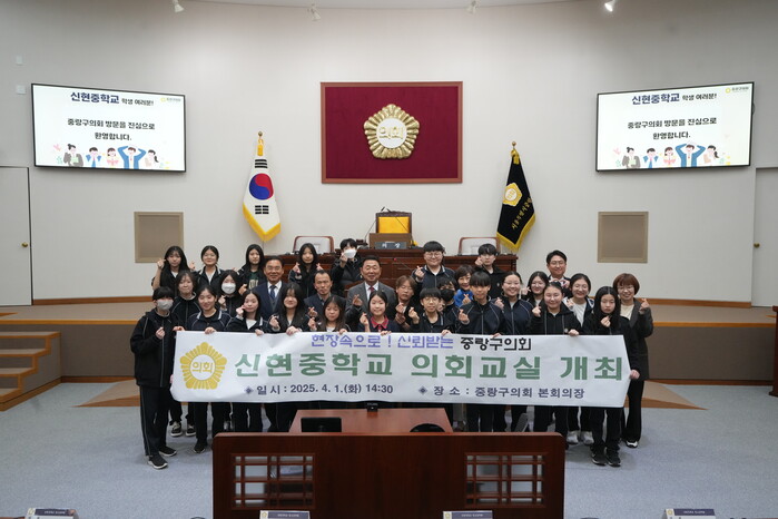 [시민일보 = 여영준 기자] 서울 중랑구의회(의장 최경보)가 최근 의회 본회의장에서 신현중학교 학생 25명이 참여한 가운데 ‘의회교실’을 개최했다.