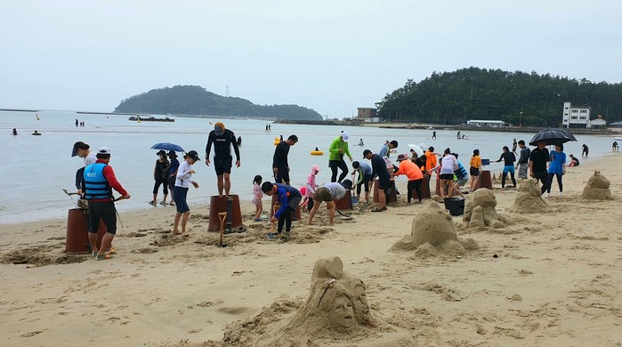 | 땅끝 송호해변축제가 열린 지난 29일~31일 모래조각 만들기에 참여하고 있는 피서객들 / 해남군 제공 |