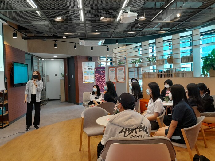 | ▲ 청소년 심리상담센터 '사이쉼'을 방문한 청소년들이 관계자로부터 센터에 대해 설명을 듣고 있는 모습. (사진=강남구청 제공) |
