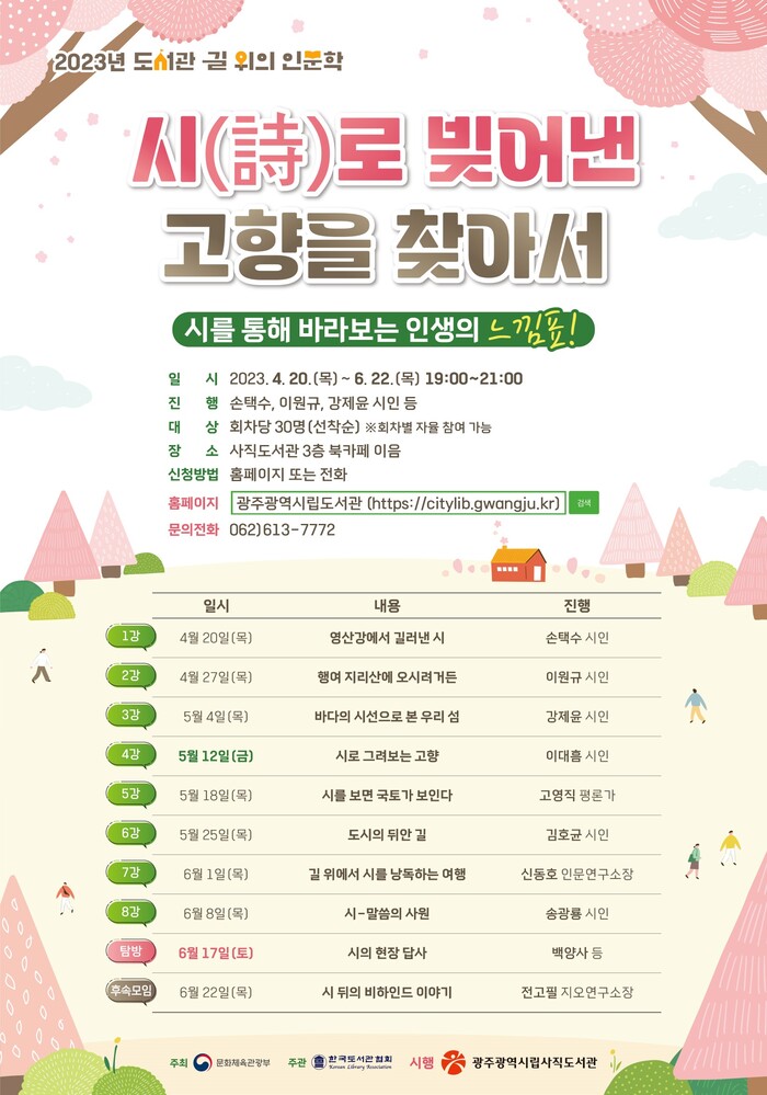 세부 주제는 ‘영산강에서 길러낸 시’,‘행여 지리산에 오시려거든’,‘바다의 시선으로 본 우리 섬’ 등이다. 특히 회차별 주제 도서와 연계해 참가자들의 소통을 이끌어내는 형식으로 운영될 예정이다.