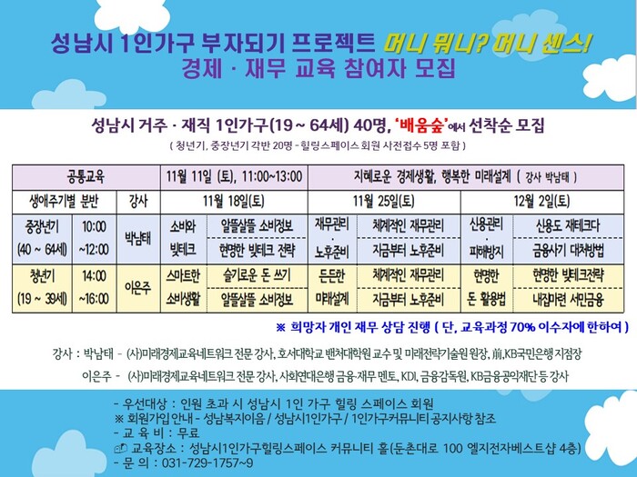 대상은 성남시 거주 및 재직하는 19세부터 64세 1인 가구이며 교육은 성남시 1인가구 힐링 스페이스 커뮤니티홀(모란역 인근 소재)에서 오는 11일, 18일, 25일과 12월 2일 4번 열릴 예정이다.