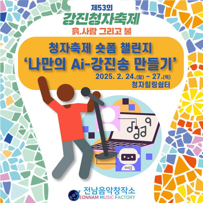 [강진=정찬남 기자] 강진군 전남음악창작소가 오는 27일까지 ‘청자축제 숏폼 챌린지 – 나만의 강진송 만들기’ 체험 프로그램을 진행한다. 이 프로그램은 강진 청자축제와 함께 강진의 문화유산과 자연경관을 음악으로 표현하는 새로운 관광 체험을 선보이는 프로그램이다.