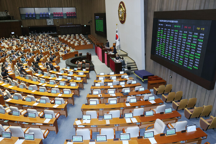 국회는 이날 오전 8시30분 본회의에서 재석 의원 187명 전원 찬성으로 방문진법 개정안을 처리했다. 표결은 야당 주도로 이뤄졌으며 방문진법 개정안에 반대했던 국민의힘은 불참했다.