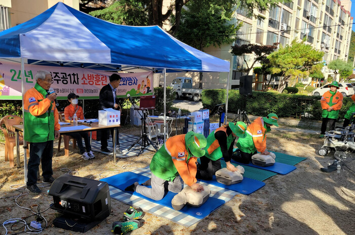 이날 교육은 중앙119안전센터와 상봉동 자율방재단이 참여하여 아파트 관리직원과 입주자들을 대상으로 소화기 작동시범과 가상화재 대피훈련, 심폐소생술의 필요사례, 환자반응 확인법, 흉부압박 심폐소생술 및 하임리히법 실습 등이 진행했다.