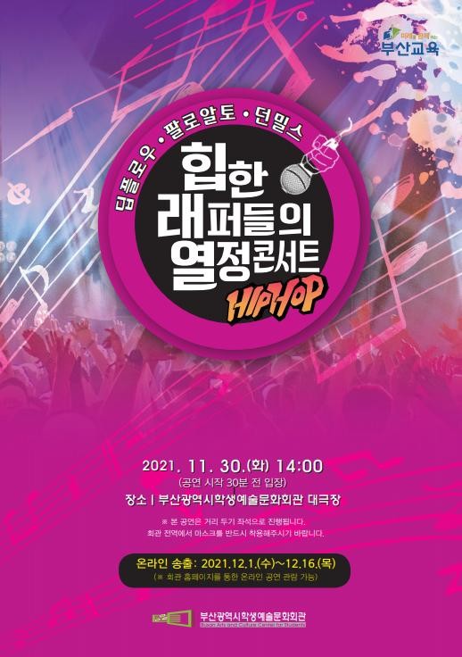 부산광역시학생예술문화회관(관장 박귀자)은 11월 30일 오후 2시 수능 및 내신성적 산출 이후 자기계발 시기를 맞은 학생들을 위해 직접 공연장을 찾지 않고도 학교와 가정에서 즐길 수 있는 온전한 예감공연 ‘힙한 래퍼들의 열정 콘서트’를 연다.