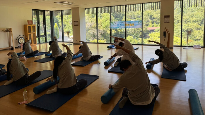 | ▲ 화성시아동청소년정신건강복지센터 청소년 캠프 _쉬멍 놀멍_ 참가자들이 스트레칭 강좌에 참여하고 있다 /사진제공=화성특례시 |