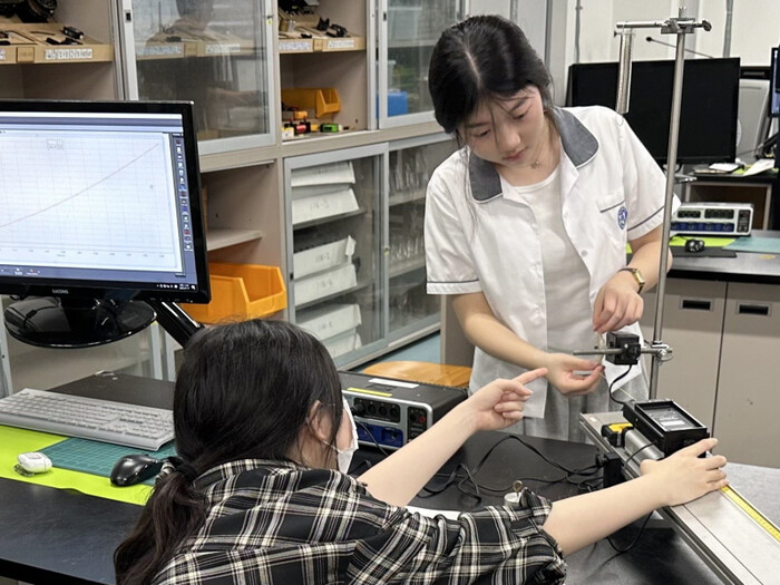 | 학생들이 대학 실험실에서 MBL을 활용, 물리 실험을 하고 있다. |