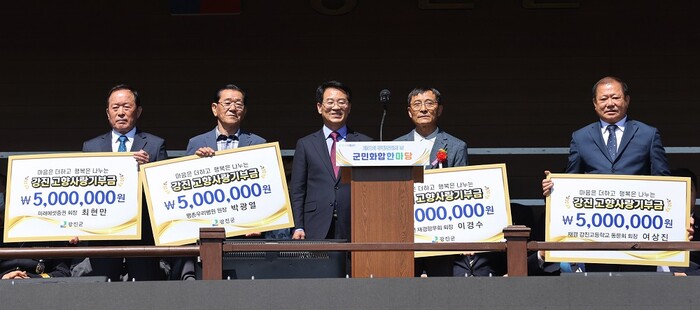 이날 ‘제51회 군민 화합 한마당 행사’에서 미래에셋증권 최현만 대표, 평촌우리병원 박광열 원장, 작천면 재경향우회 이경수 회장, 재경 강진고등학교 동문회 여상진 회장이 고향사랑기부제 최고 금액인 500만 원을 각각 기탁했다.