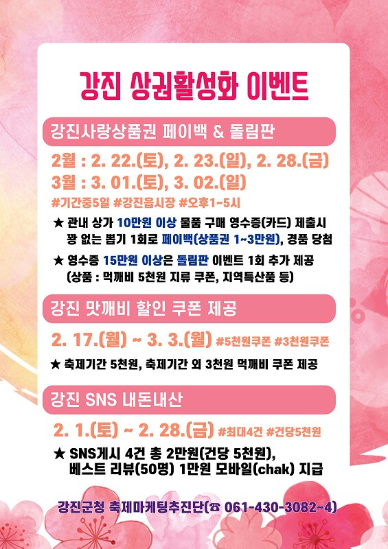 이번 이벤트는 상가 방문 및 소비 촉진 유도와 강진읍 상권의 활력을 불어넣기 위해 진행된다. 주요 이벤트로는 강진사랑상품권 영수증 페이백 이벤트, 꽝 없는 돌림판 이벤트, ‘강진맛깨비’ 먹깨비 할인 이벤트, SNS 내돈내산 특별 이벤트 등이 있다.