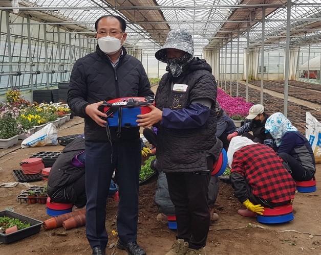 | ▲ 김기수 해남군농업기술센터 소장, 관내 농가에 농작업용 쪼그리방석 전달 / 사진=해남군 제공 |