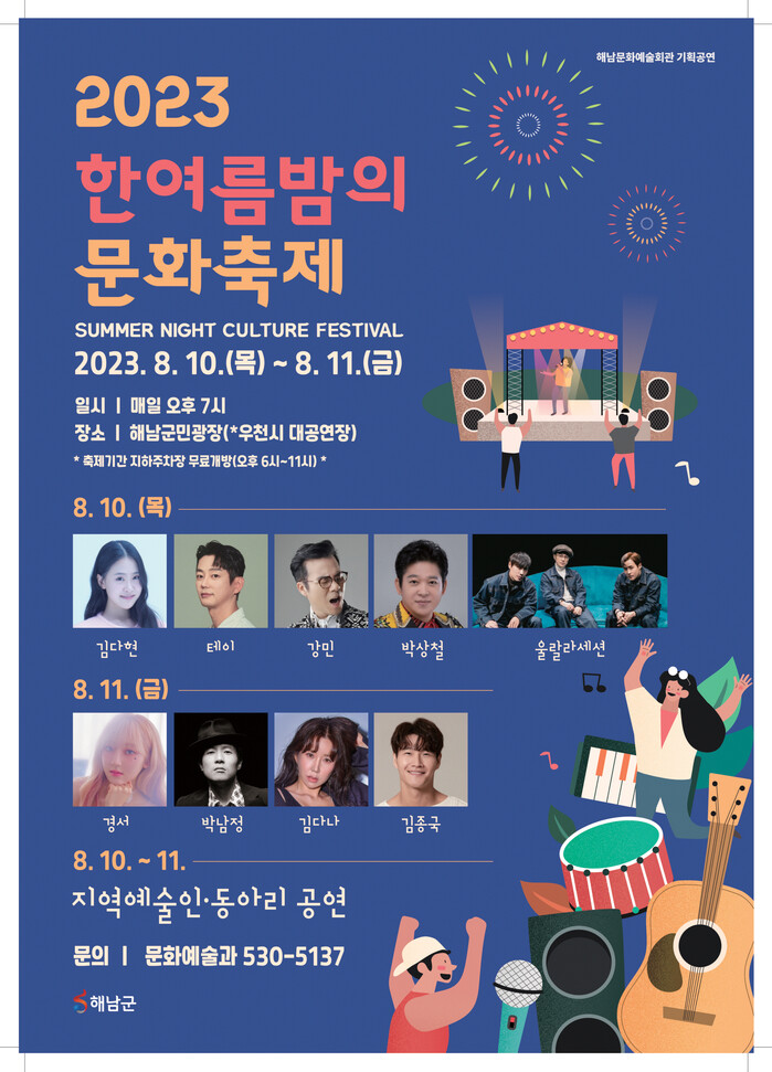 전남 해남군은 오는 10~11일 오후 7시부터 인기가수들의 뜨거운 무대로 꾸며지는 2023 한여름밤의 문화축제를 군민광장 특설무대에서 개최한다.