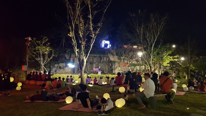 | ▲ 강진군을 방문한 관광객 및 강진지역주민들이 세계모란공원에서 진행된 강진 나이트 드림 프로그램을 참관하고 있다. / 강진군 제공 |