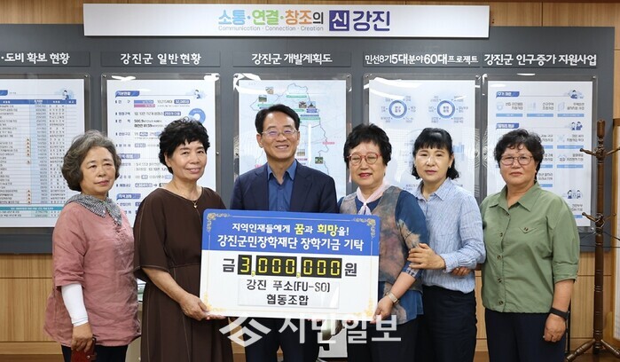 [강진=정찬남 기자] 전남 강진군 미래 인재 양성을 위한 장학금 기탁이 이어지고 있다. 강진푸소협동조합 이은옥 이사장 및 조합원들은 지난 27일 3백만 원의 소중한 장학금을 강진군민장학재단(강진원)에 기탁 했다.