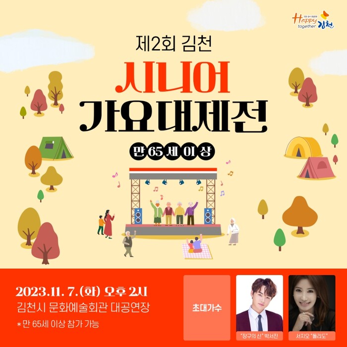 본선에는 읍.면동 예선을 통해 선발된 지역 대표 20명의 어르신이 그동안 갈고 닦은 노래 실력을 마음껏 펼치는 가요경연과 초청 가수 박서진, 서지오의 공연이 펼쳐진다.