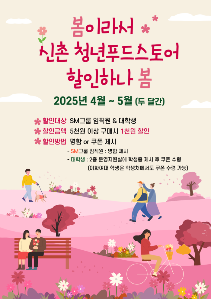 신촌 청년푸드스토어 2층 운영지원실에 대학 학생증을 제시하면 할인쿠폰을 받을 수 있다. 구는 이화여대 학생처에서도 쿠폰을 비치했다. SM그룹 직원들은 명함을 제시하면 된다.