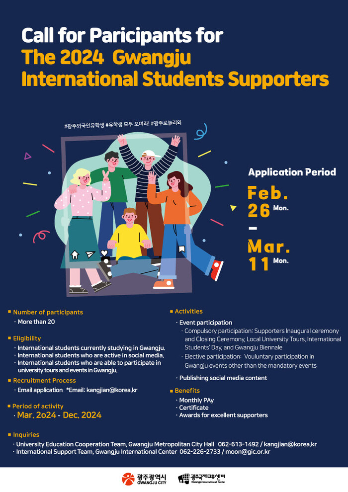 신청을 희망하는 유학생은 광주시 누리집 고시·공고에 게시된 공고문을 참고해 신청서를 내려받아 작성 후 이메일로 제출하면 된다. 신청 접수는 다음달 3월 11일 오후 6시까지이다.