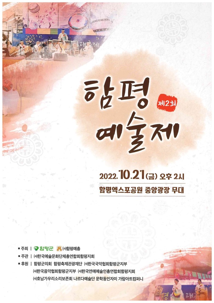 함평군이 주최하고 (사)한국예술문화단체총연합회 함평지회가 주관하는 함평예술제는 지역 예술인의 재능 확산과 역량 결집을 위해 마련됐다.