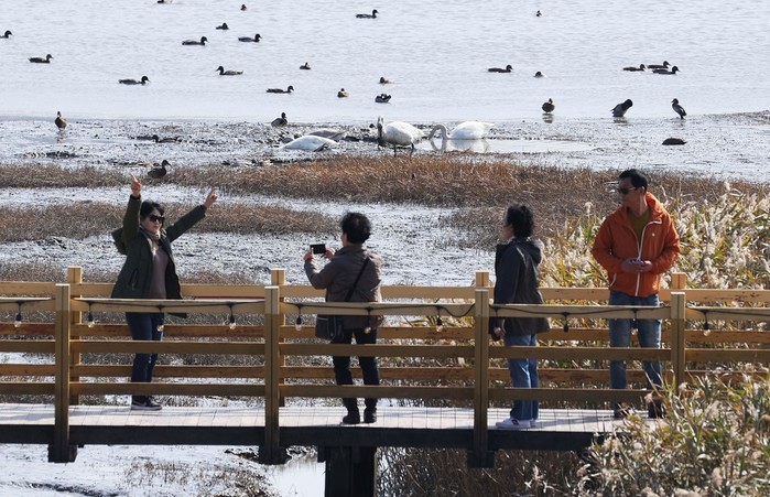 | ▲ 강진만 갈대축제장을 찾은 관광객들이 고니와 기러기 등이 노니는 강진만을 배경으로 기념촬영을 하고 있다. / 사진=강진군 제공 |