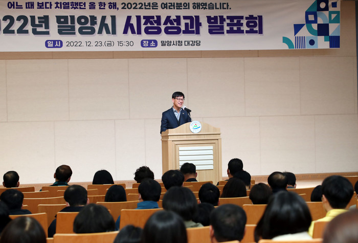 [밀양=최성일 기자] 밀양시(시장 박일호)는 지난 23일 시청 대강당에서 간부공무원을 비롯한 전 직원이 참석한 가운데 2022년의 성과를 총결산하는 시정성과 발표회를 가졌다.