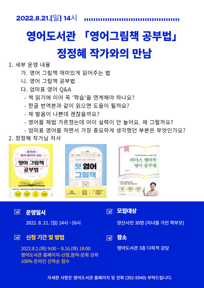 정정혜 작가와의 만남은 양산 시민(자녀를 가진 학부모) 30명을 대상으로 8월 2일(화)부터 8월 16일(화)까지 영어 도서관 홈페이지를 통해 선착순으로 모집하며, 기타 자세한 사항은 영어 도서관 홈페이지 공지사항을 통해 확인하거나 영어 도서관으로 문의하면 된다.