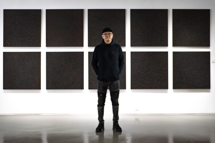 이번 전시에서 공개된 ‘Flower King’ 시리즈의 신작은 모란꽃의 붉은 색상과 신비로움을 경면주사 기법으로 표현해 주목받았다. 인간의 영적 변화와 우주적 순환을 화(火) 에너지를 상징하는 붉은 모란으로 그려냈다.