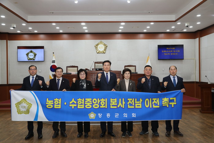 [장흥=황승순 기자]장흥군의회은 제279회 임시회에서‘농협·수협 중앙회 본사 전남 이전’을 촉구하는 건의안을 7명 의원 만장일치로 채택했다.