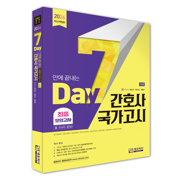 특히 ‘7일 만에 끝내는 간호사국가고시 2065제’는 출간 전 현역 간호사 및 간호학과 재학생을 대상으로 한 사전 테스트를 통해 변별력 없는 문제 또는 실제 출제 수준과 동떨어진 문제를 과감히 제외하고, 시험과 가장 유사한 문제만을 수록하는 과정을 거쳐 실전 대비에 적합하다는 평을 받고 있다.