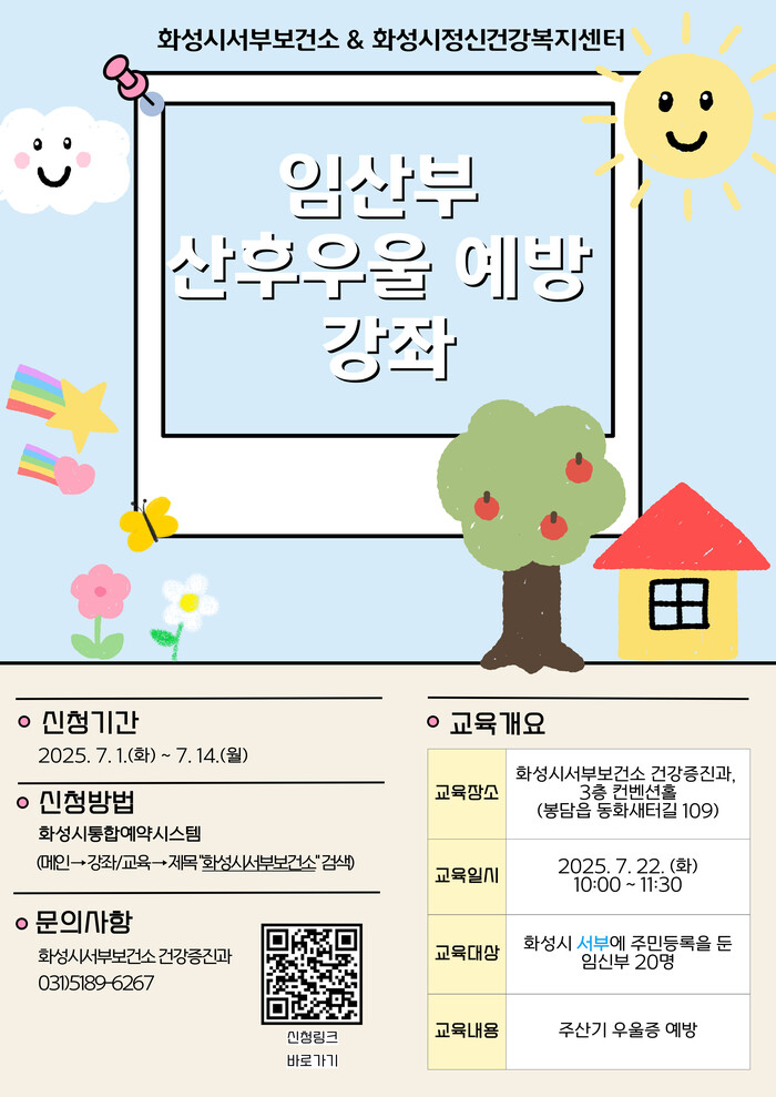 [화성=송윤근 기자] 경기 화성특례시(시장 정명근)가 화성시정신건강복지센터와 함께 운영하는 ‘산후우울증 예방 강좌’ 참가자를 선착순 모집한다고 4일 밝혔다.