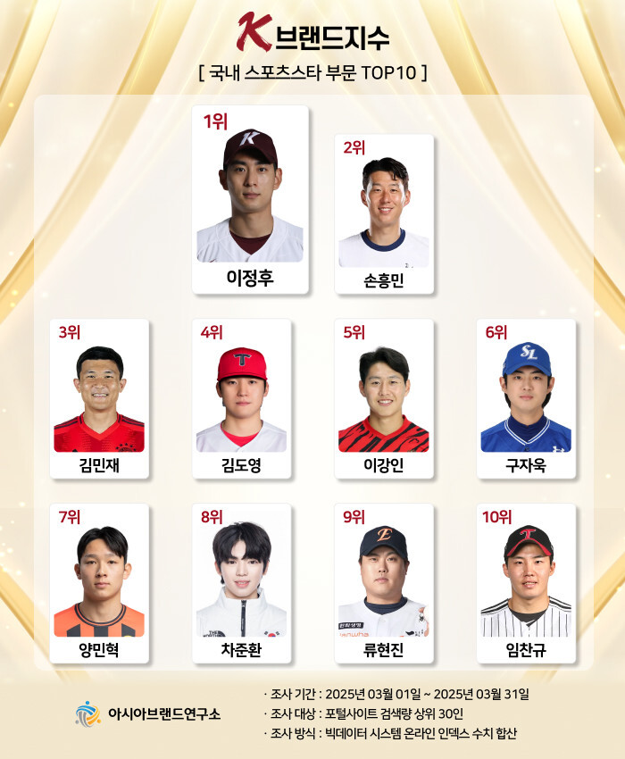 이번 K-브랜드지수 스포츠스타 부문은 포털사이트 검색량 상위 30인을 대상으로, 2025년 3월 1일부터 3월 31일까지의 온라인 빅데이터 1억 7619만 6792건을 분석했다.