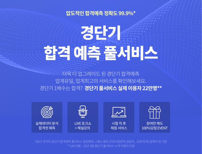 합격예측 풀서비스는 △채점 서비스 △실시간 경쟁률 확인 △지역별 예상 합격 컷 △라이브 총평 등 시험 관련 서비스를 모두 제공하는 서비스다.